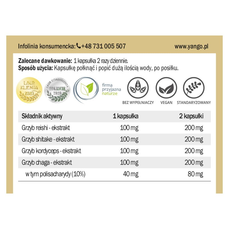 Ekstrakt z grzyba reishi (Ganoderma lucidum) standaryzowany na min. 10% polisacharydów, ekstrakt z grzyba shitake (Lentinula edodes) standaryzowany na zawartość min. 10% polisacharydów, ekstrakt z grzyba kordyceps (Cordyceps sinensis) standaryzowany na zawartość min. 10% polisacharydów, ekstrakt z grzyba chaga (Inonotus obliguus) standaryzowany na zawartość min. 10% polisacharydów, skład kapsułki: celuloza roślinna