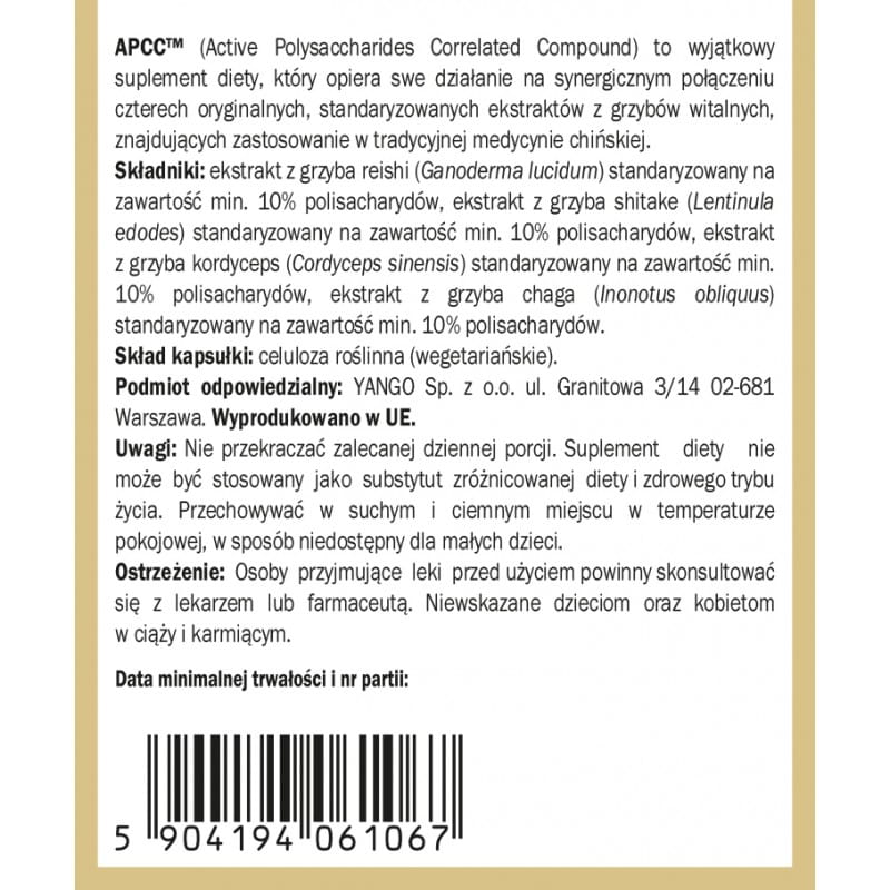 APCC jest unikalną formułą łączącą cztery grzyby witalne, standaryzowane na 10% polisacharydów.