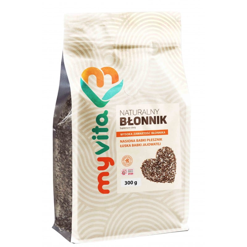 Błonnik naturalny MyVita 300 g to połączenie nasion babki płesznik i łusek babki jajowatej. Produkt zawiera 60% błonnika pokarmowego.
