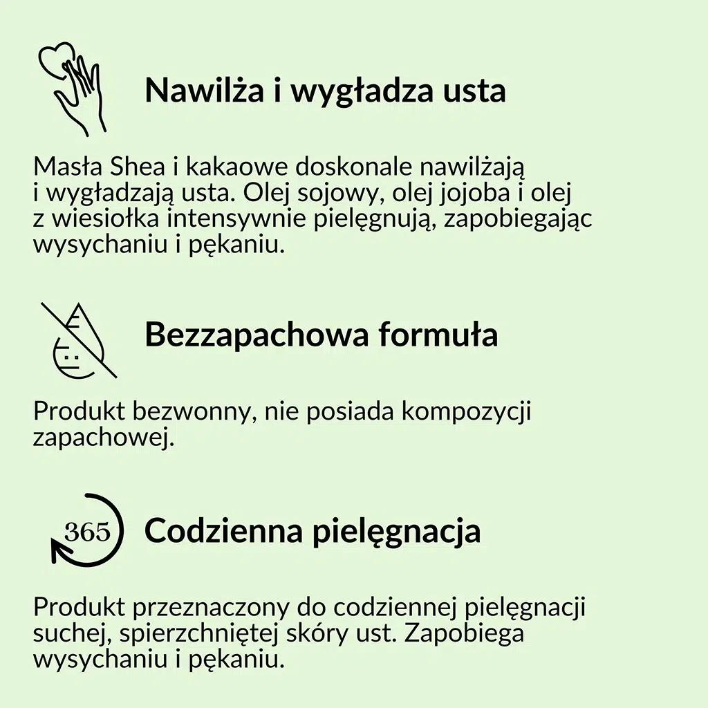 Obecne w składzie masło shea i masło kakaowe posiadają działanie wygładzające oraz uelastyczniające. Z kolei oleje sojowy, jojoba i wiesiołkowy nawilżają usta oraz zapobiegają ich wysychaniu i pękaniu. Pomadka świetnie się sprawdza jako bariera ochronna przed mrozem, wiatrem i słońcem. Jest hipoalergiczna. Zawarta w niej betulina wykazuje działanie kojące i regenerujące, a także łagodzi objawy opryszczki.