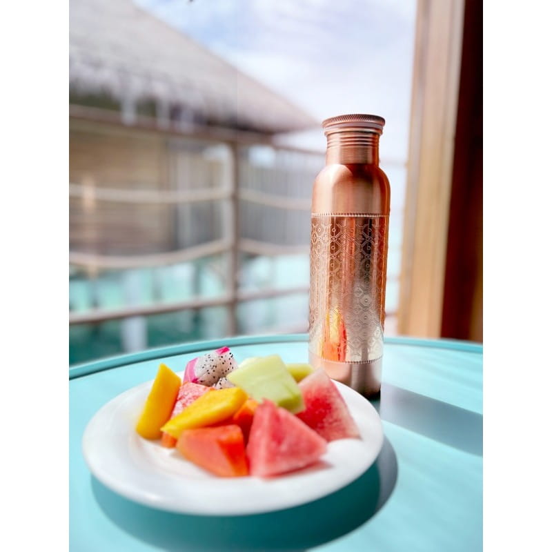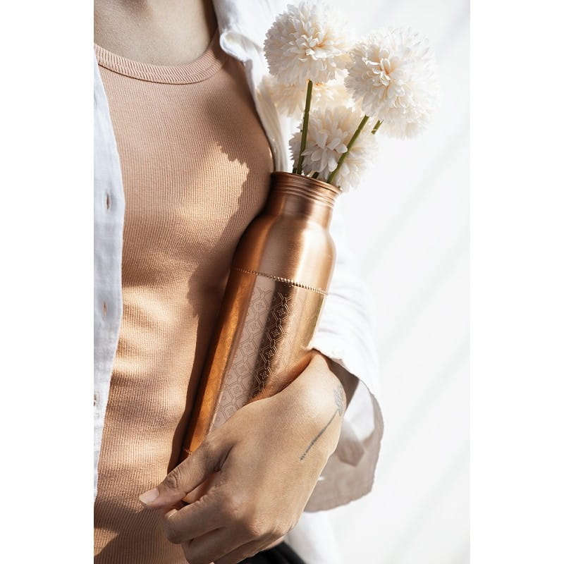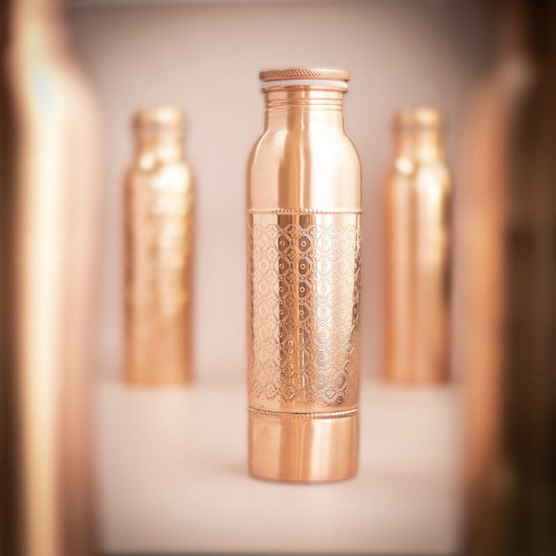 Ta butelka to o wiele więcej niż zwykła butelka. Przechowywanie wody w butelce przez noc przekształca ją we wzbogaconą w miedź Tamre Jal (miedziana woda), dzięki czemu jest ona naturalnie zasadowa. Wiadomo, że miedziana woda przywraca równowagę wszystkim trzem duszom, czyli energiom w ciele (vata, pitta i kapha).