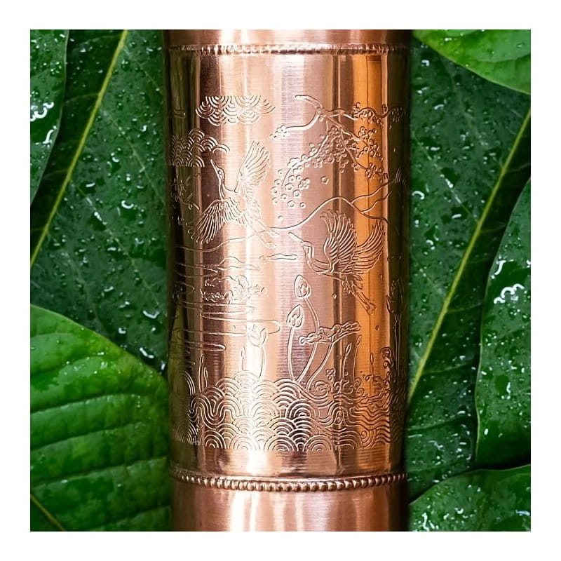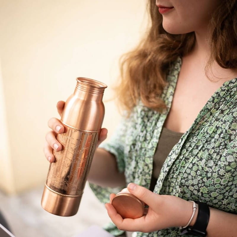 Ta butelka to o wiele więcej niż zwykła butelka. Przechowywanie wody w butelce przez noc przekształca ją we wzbogaconą w miedź Tamre Jal (miedziana woda), dzięki czemu jest ona naturalnie zasadowa. Wiadomo, że miedziana woda przywraca równowagę wszystkim trzem duszom, czyli energiom w ciele (vata, pitta i kapha).