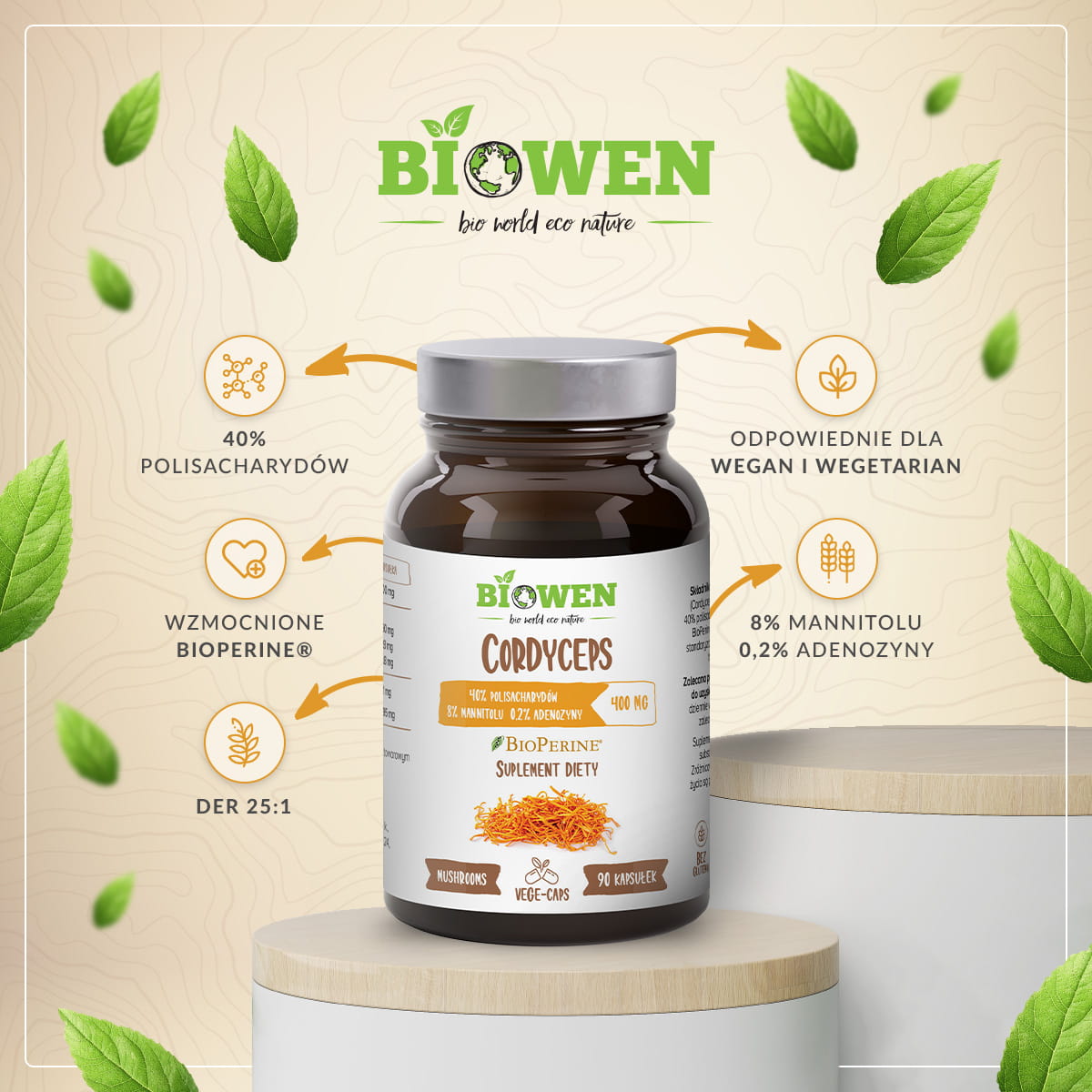 Produkt maczużnik chiński ekstrakt Biowen to 90 wegańskich kapsułek, w których znajdziesz standaryzowany ekstrakt z kordycepsu, który powstał z grzybni. Jego DER wynosi 25:1, a standaryzacje to 40% polisacharydów, 8% mannitolu oraz 0,2% adenozyny. Standaryzacja na polisacharydy jest niezwykle ważna w przypadku grzybów i jej optymalny poziom wynosi właśnie ok. 40%. Wtedy produkt jest najbardziej wartościowy. Dodatkowym składnikiem jest standaryzowany aż na 95% ekstrakt z pieprzu czarnego (BioPerine®), który wzmacnia działanie ekstraktu z kordycepsu zawartego w kapsułkach.