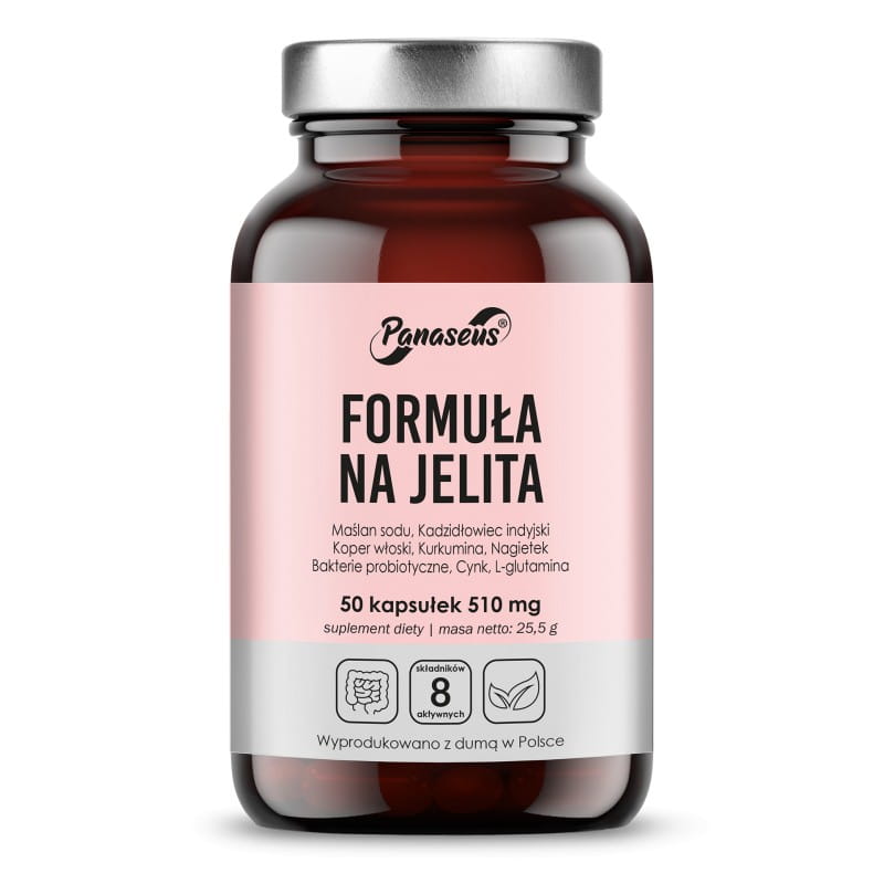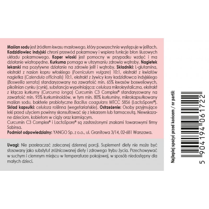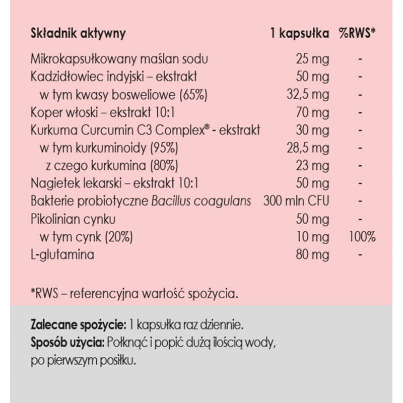L-glutamina, ekstrakt z nasion kopru włoskiego (Foeniculum vulgare) 10:1, ekstrakt z kwiatów nagietka (Calendula officinalis) 10:1, ekstrakt z żywicy kory kadzidłowca indyjskiego (Boswellia serrata) standaryzowany na 65% zawartości kwasów bosweliowych, pikolinian cynku (cynk), substancja wypełniająca: inulina z korzenia cykorii (prebiotyk), ekstrakt z kłącza kurkumy (Curcuma longa) CurcuminC3 Complex® standaryzowany na zawartość min. 95% kurkuminoidów, w tym min. 75% kurkuminy, maślan sodu, bakterie probiotyczne Bacillus coagulans MTCC 5856 (LactoSpore®), skład kapsułki: celuloza roślinna (wegetariańskie)