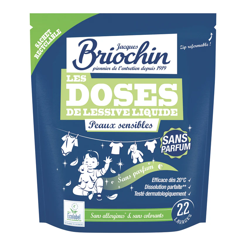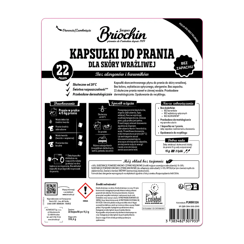 Kapsułki do prania Briochin dla skóry wrażliwej to rozwiązanie stworzone z myślą o osobach, które zmagają się z problemami skórnymi lub preferują delikatne środki czystości. Produkt nie zawiera barwników, wybielaczy optycznych, alergenów ani zapachów, co czyni go bezpiecznym i skutecznym wyborem zarówno dla alergików, jak i osób o wrażliwej skórze, w tym dzieci.