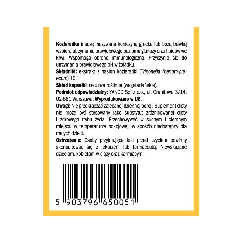 Ekstrakt z nasion kozieradki (Trigonella foenum-graecum) 10:1, skład kapsułki: celuloza roślinna (wegetariańskie)