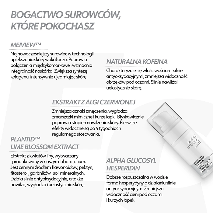 Naturalna kofeina widocznie redukuje opuchliznę pod oczami, co potwierdziło 90% badanych osób, oraz intensywnie nawilża i uelastycznia delikatną skórę. Ekstrakt z algi czerwonej Jania Rubens wygładza zmarszczki mimiczne i kurze łapki, redukując ich widoczność nawet o 23%. W formule kremu zastosowano również ekstrakt z kwiatów lipy, który działa silnie antyoksydacyjnie, nawilża i uelastycznia skórę. Alfa glukozylowa hesperydyna skutecznie zmniejsza widoczność cieni i kurzych łapek, a masło tucuma, bogate w kwasy tłuszczowe, regeneruje, nawilża i zapobiega nadmiernej utracie wody.