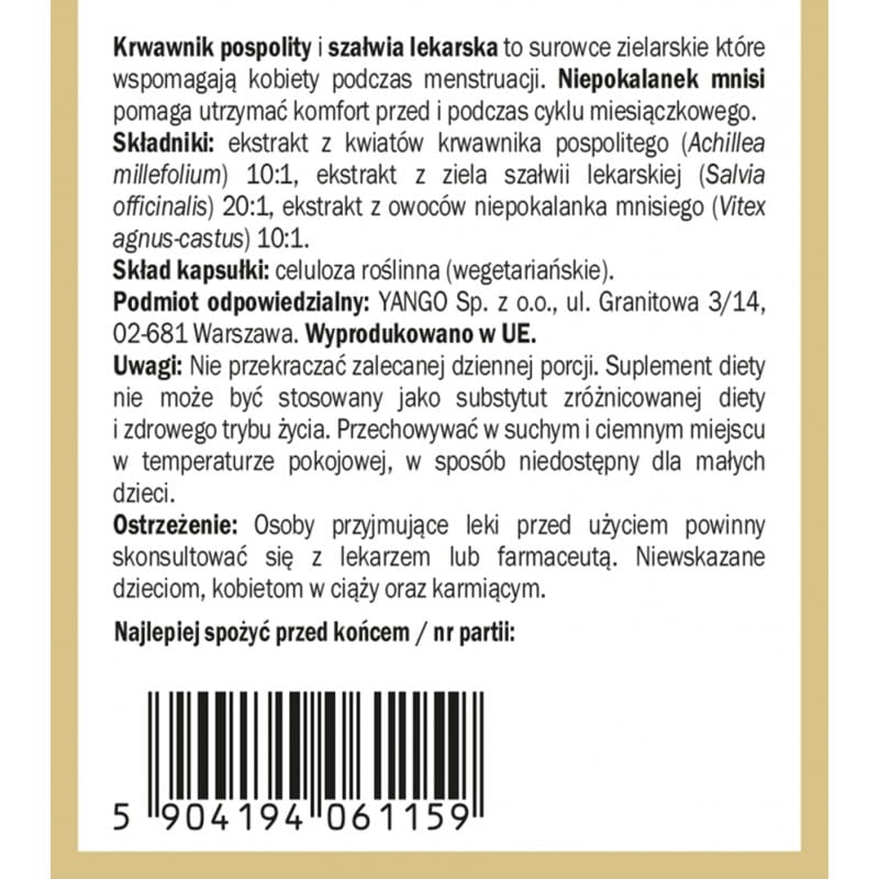 Ekstrakt z kwiatów krwawnika pospolitego (Achillea millefolium) 10:1, ekstrakt z ziela szałwii lekarskiej (Salvia officinalis) 20:1, ekstrakt z owoców niepokalanka mnisiego (Vitex agnus-castus) 10:1, skład kapsułki: celuloza roślinna (wegetariańskie)
