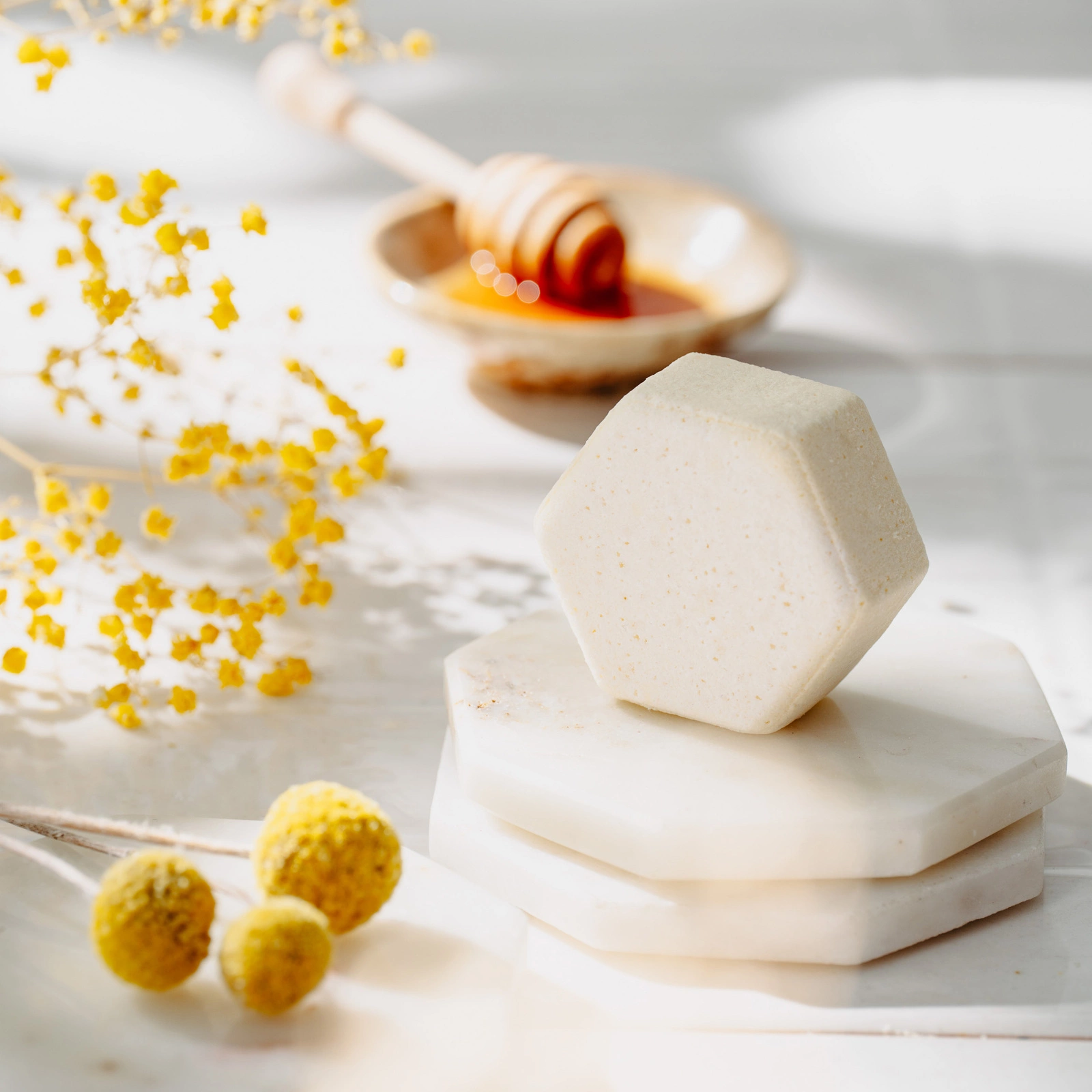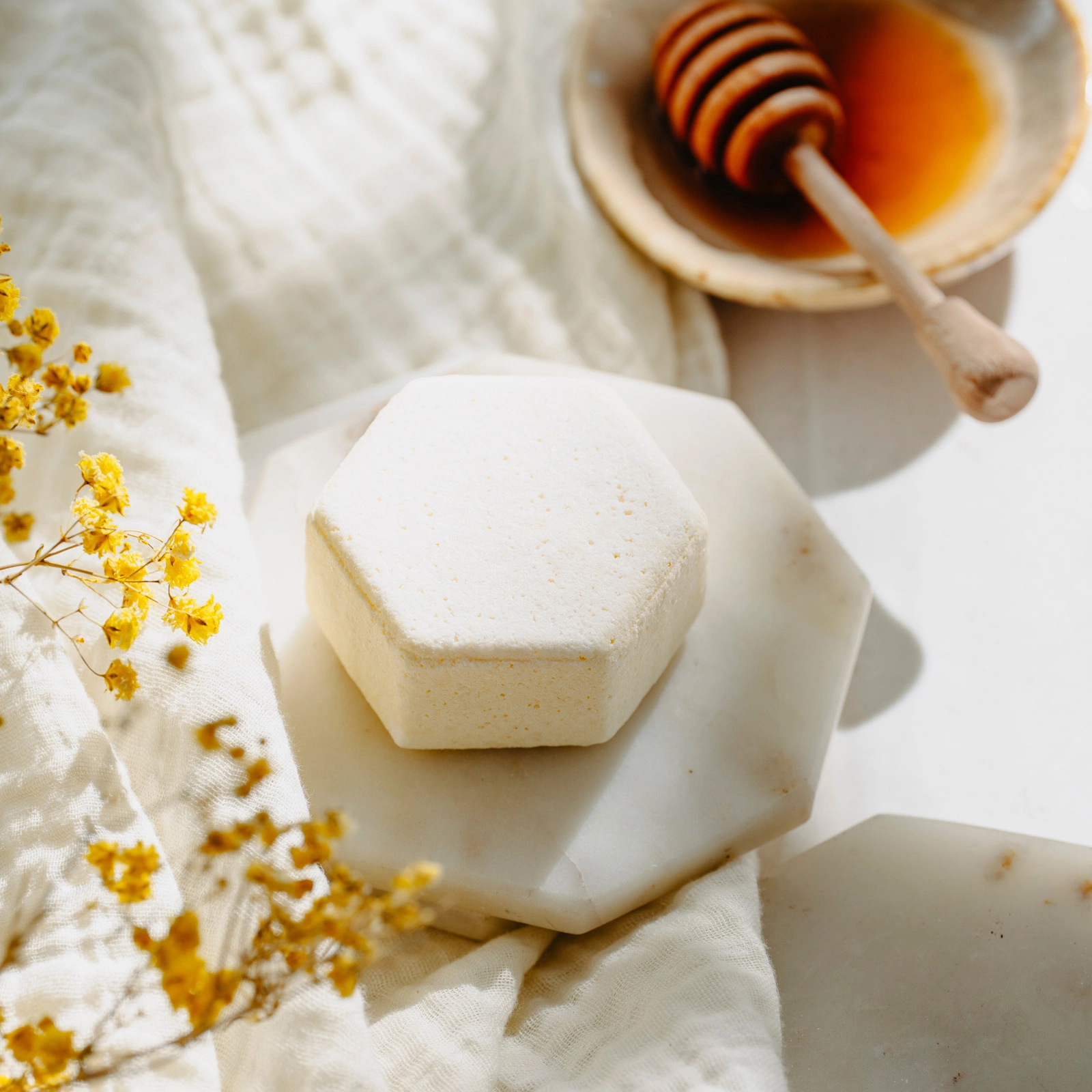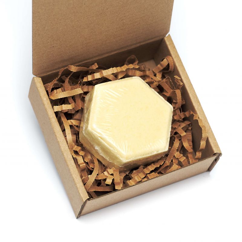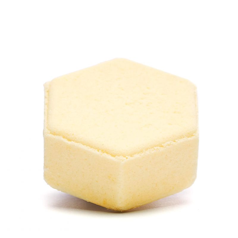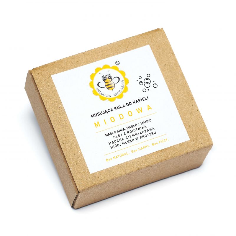 Musująca, aromatyczna kula do kąpieli, w formie heksagonu, nawilżająca, z odżywczymi i kojącymi: miodem, mlekiem, mączką ziemniaczaną, masłami shea i z mango oraz olejem z rokitnika. Pachnie, przyjemnie słodko, miodowo, przywodząc na myśl łąkę wypełnioną słodkim aromatem kwiatów w letni, wakacyjny dzień.
