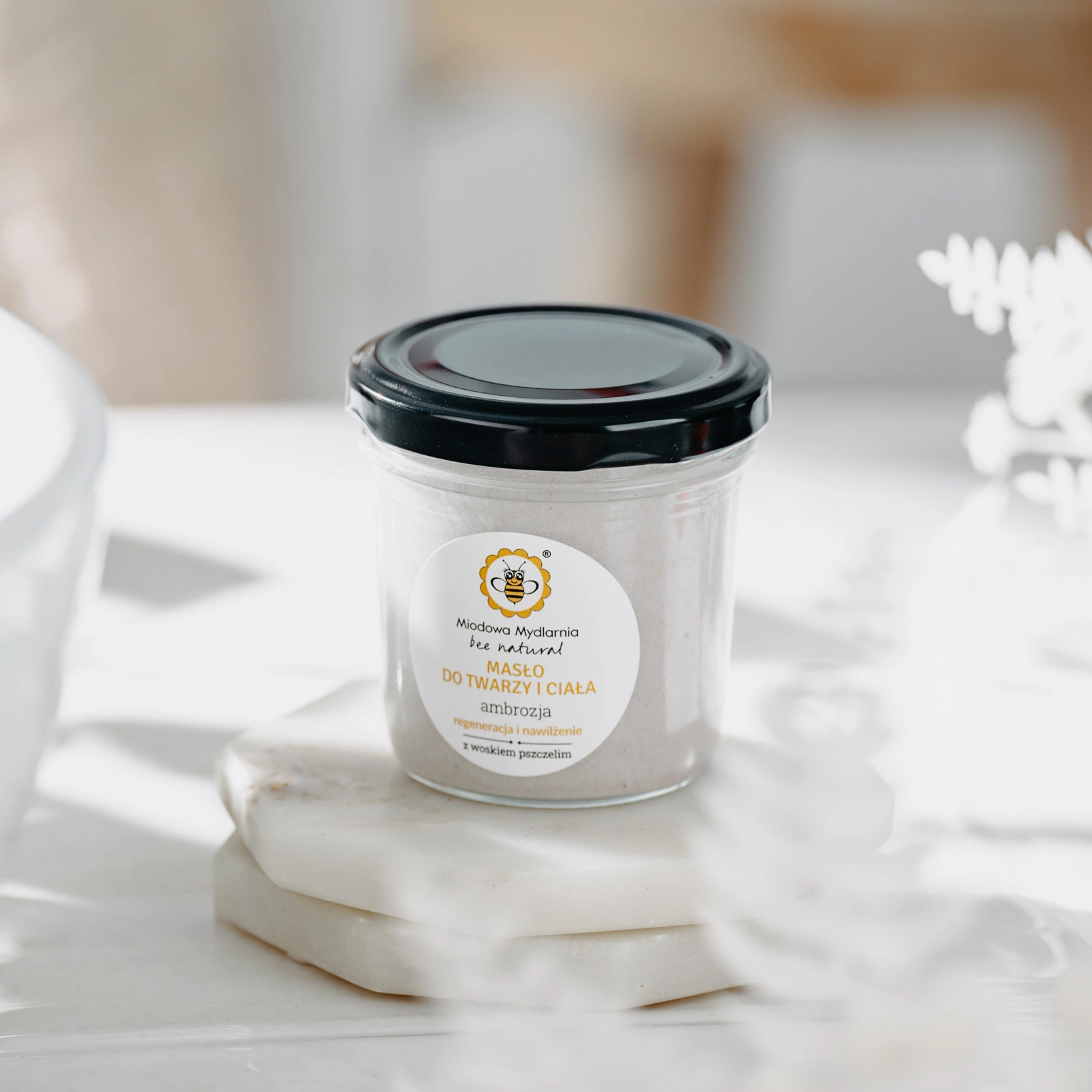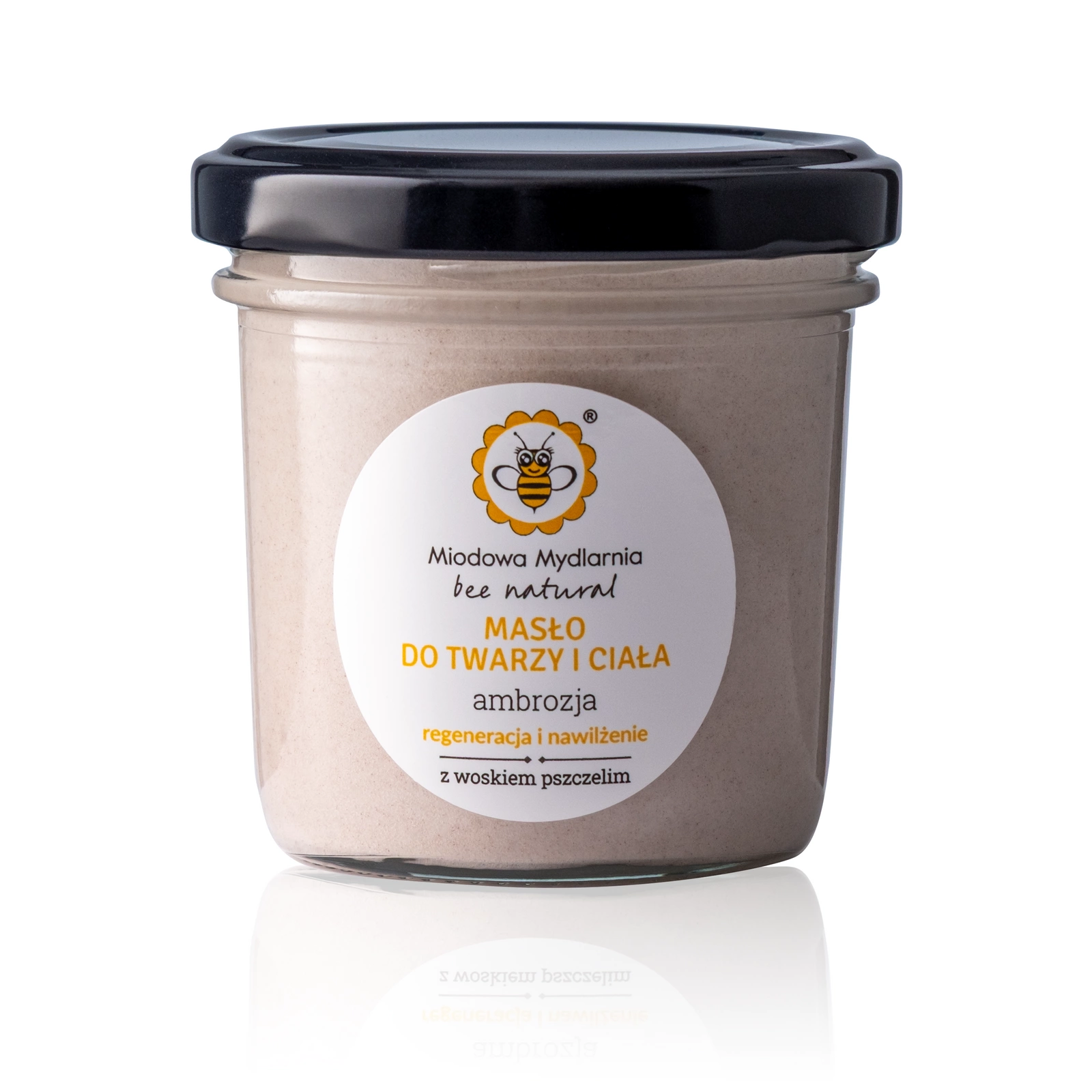 Ambrozja Bee Natural to naturalne masło z woskiem pszczelim i ekstraktem z czerwonego wina przeznaczone do pielęgnacji twarzy i ciała. Jest bogate w składniki odżywcze o działaniu przeciwstarzeniowym. Posiada puszystą konsystencję musu i słodki, kobiecy aromat.