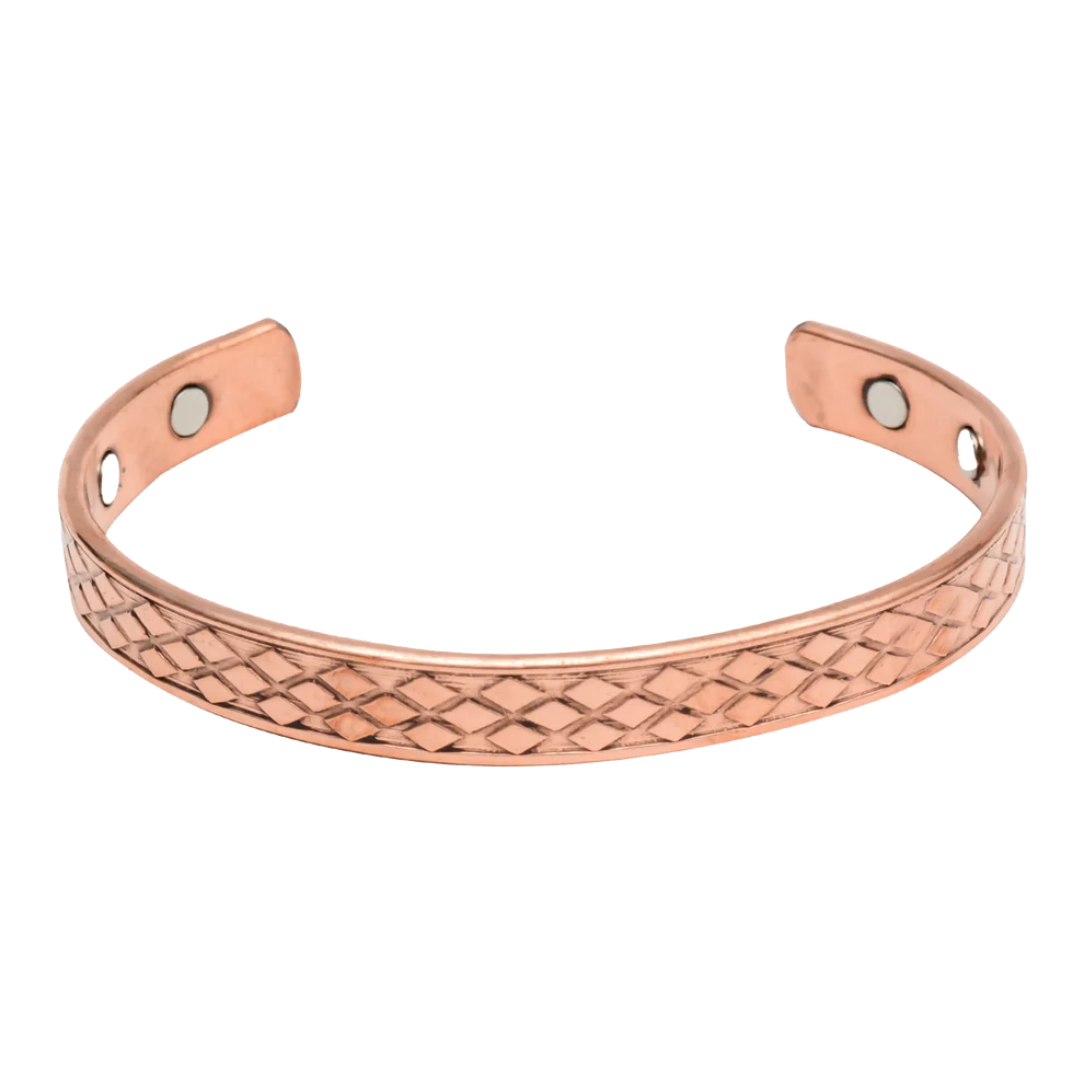 Elegancka i tradycyjnie wykonana miedziana bransoletka z delikatnym grawerowanym wzorem i wbudowanymi magnesami. Wykonana z wysokiej jakości miedzi, łączy w sobie piękno biżuterii z prozdrowotnymi właściwościami, inspirowanymi Ajurwedą.
