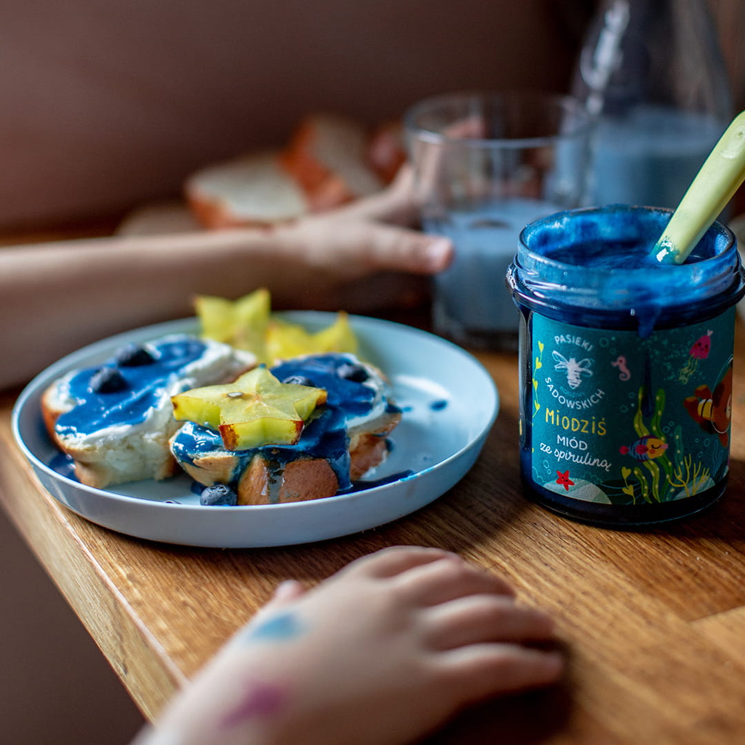 Skład Miodzisia - Miodu ze spiruliną to natura zamknięta w słoiku. Do miodu wielokwiatowego została dodana szczypta niebieskiej spiruliny, która nie zmienia jego słodkiego smaku, a dodaje bajkowego, niebieskiego koloru!