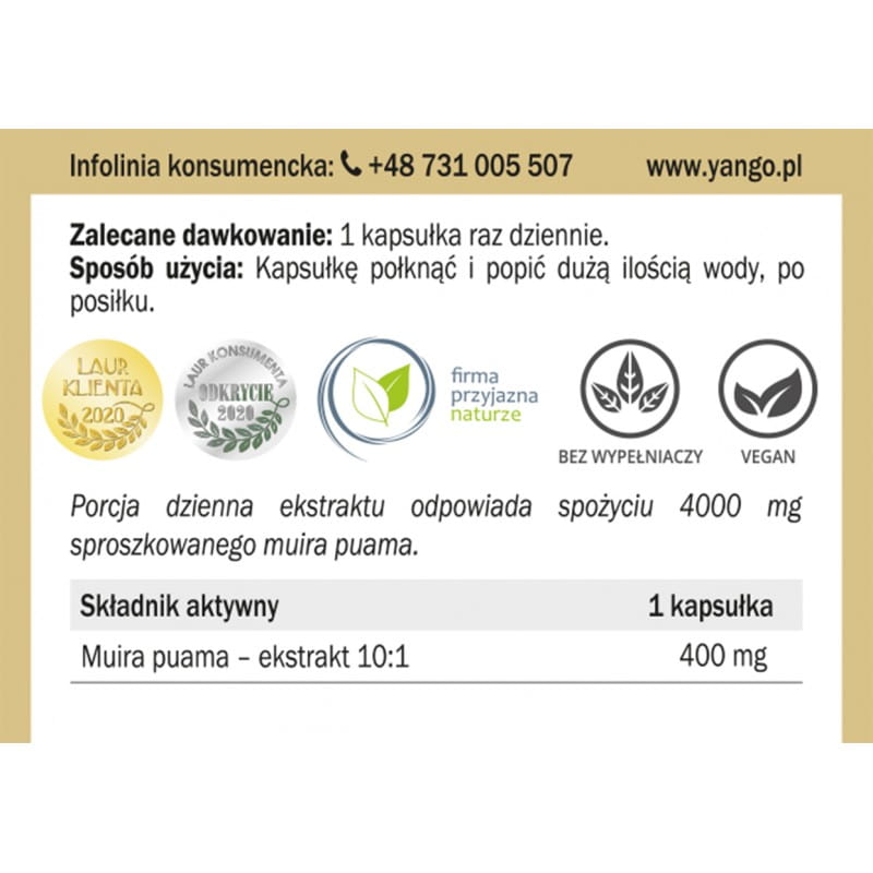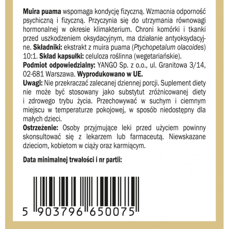 Ekstrakt z muira puama (Ptychopetalum olacoides) 10:1, skład kapsułki: celuloza roślinna (wegetariańskie)