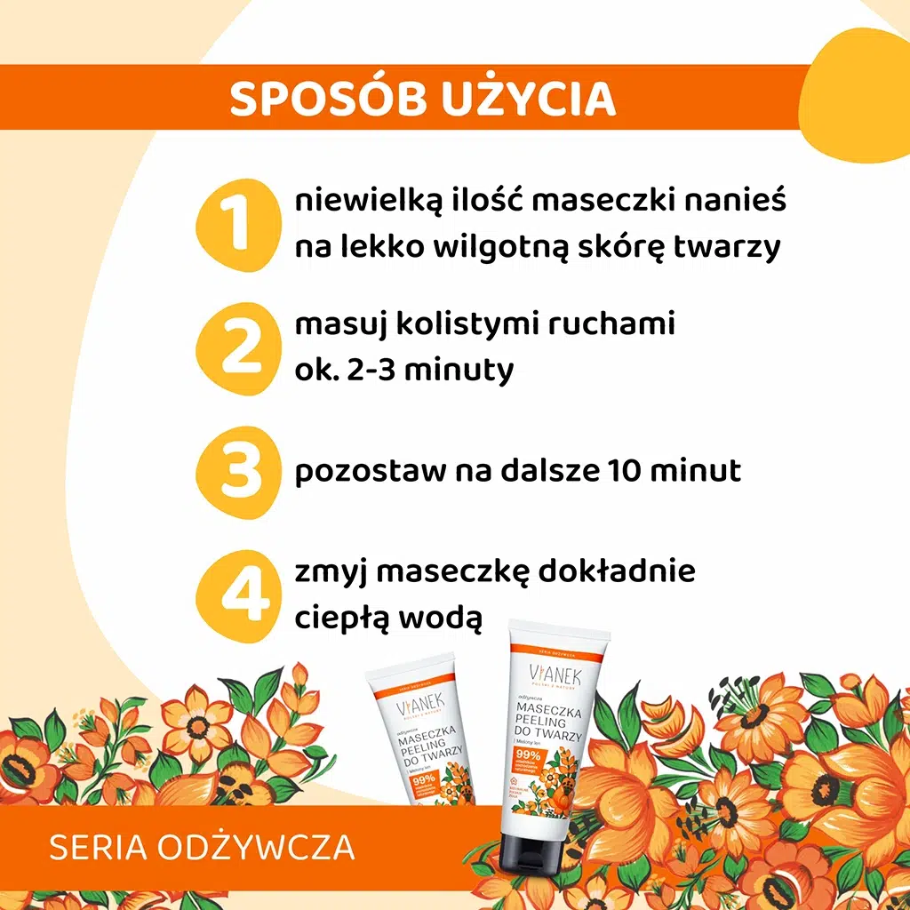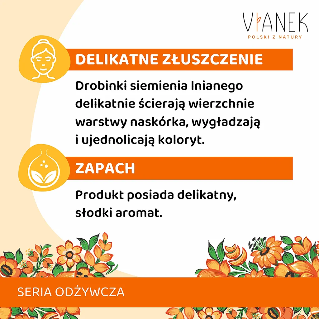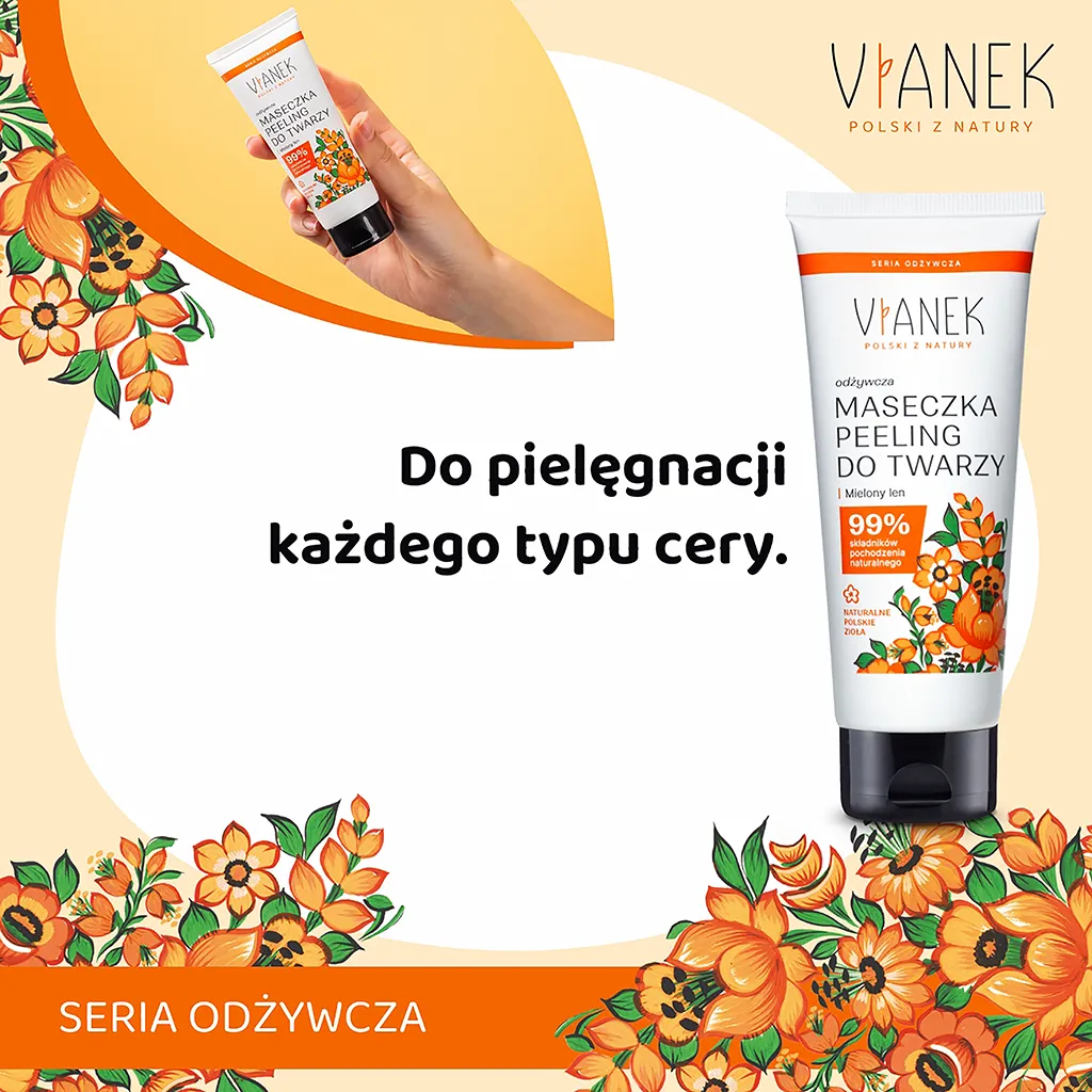 Kosmetyk jest połączeniem łagodnego peelingu z drobno zmielonego siemienia lnianego i odżywczej maseczki. Jest odpowiedni dla każdego typy cery, nawet tej najbardziej wrażliwej, ponieważ ma delikatną formułę.