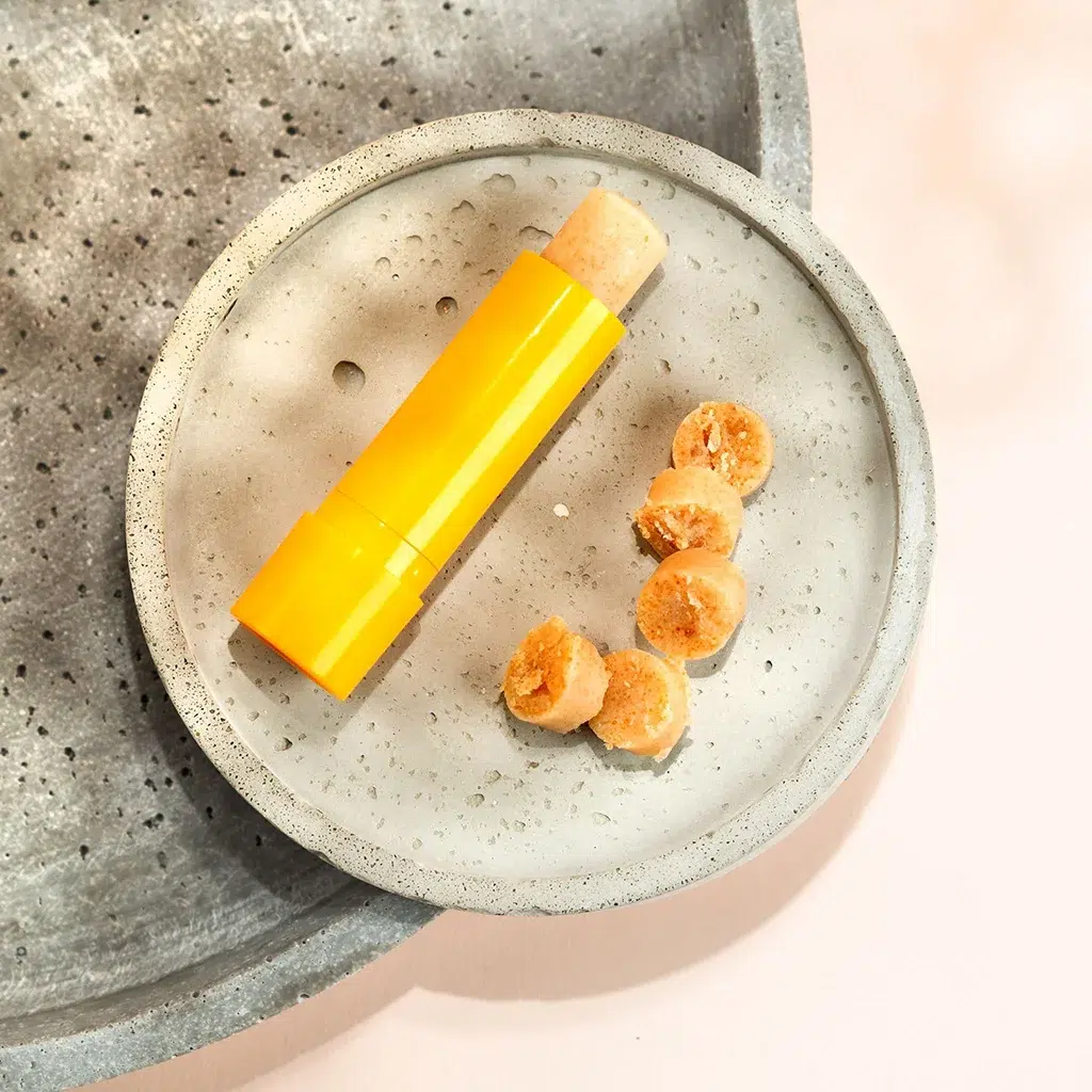 Naturalna, odżywcza pomadka z naturalnymi drobinkami ścierającymi w postaci brązowego cukru trzcinowego delikatnie złuszcza i wygładza usta.