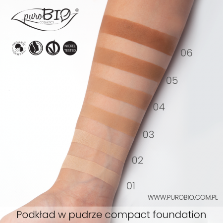 Podkład w pudrze to produkt kryjąco-matujący. Poziom krycia można budować w zależności od potrzeb. Podkład w pudrze doskonale kryje wszelkie niedoskonałości i przebarwienia. Jest bardzo lekki, nie obciąża skóry. Zawartość krzemionki i mica, wchłaniających nadmiar sebum sprawia, że podkład compact foundation puroBIO jest odpowiedni dla cery normalnej i tłustej.