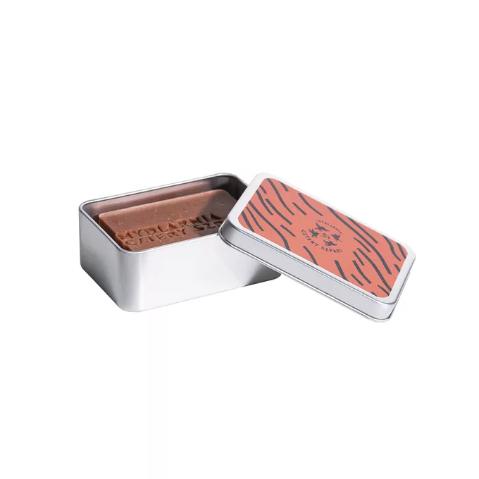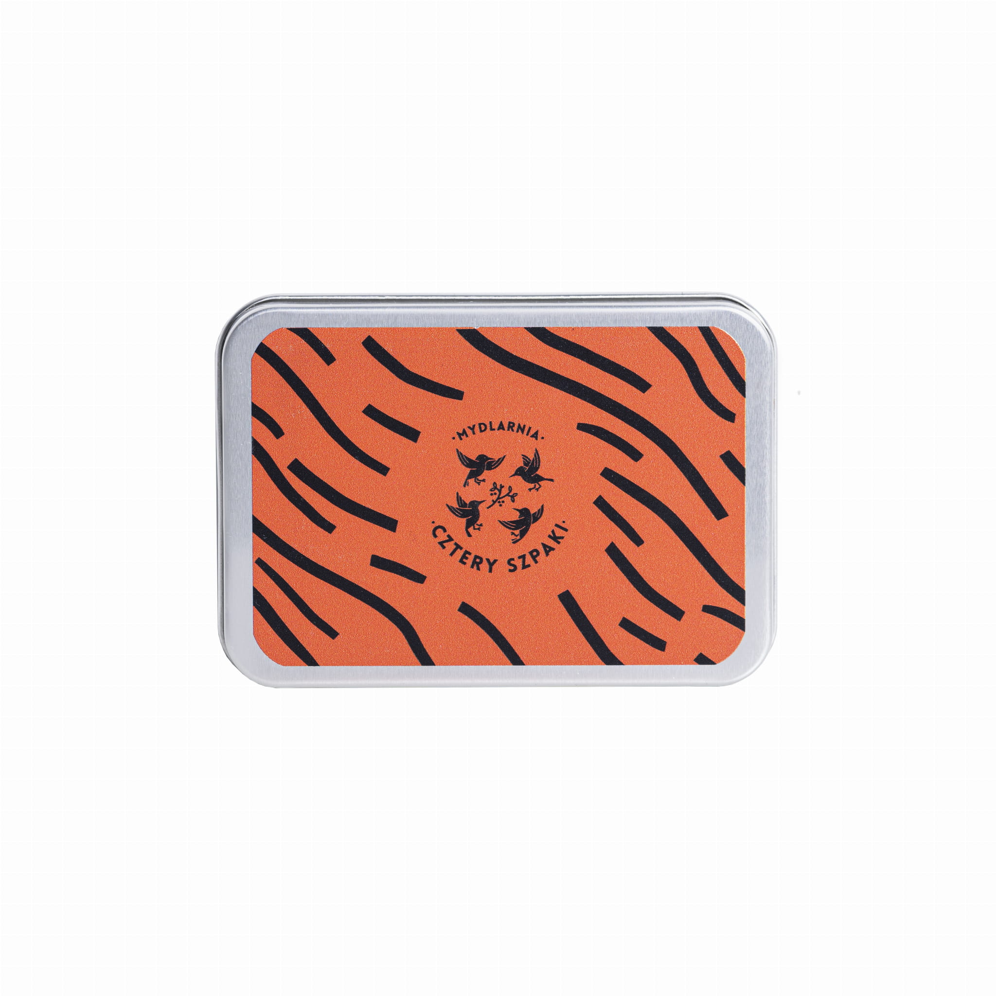 Prostokątna puszka idealnie mieszcząca kostkę mydła. Klasyczne, nakładane wieczko zyskało genialną grafikę tygrysa. Puszka została wykonana z aluminium, a co za tym idzie odnajdzie się w wodnych warunkach bez ryzyka korozji. Odporny na wodę (a także wszelkiego rodzaju zdrapania) jest również nadruk na przykrywce. Pojemniczek to praktyczna i wygodna opcja na przechowywanie nie tylko mydła - zmieści się do niej szampon lub odżywka w kostce. A zmydlone już nieco egzemplarze (bądź ukrojone do rozmiarów „travel”) wejdą do środka w pełnym pakiecie i uczynią z puszki wyjazdowego pewniaka.