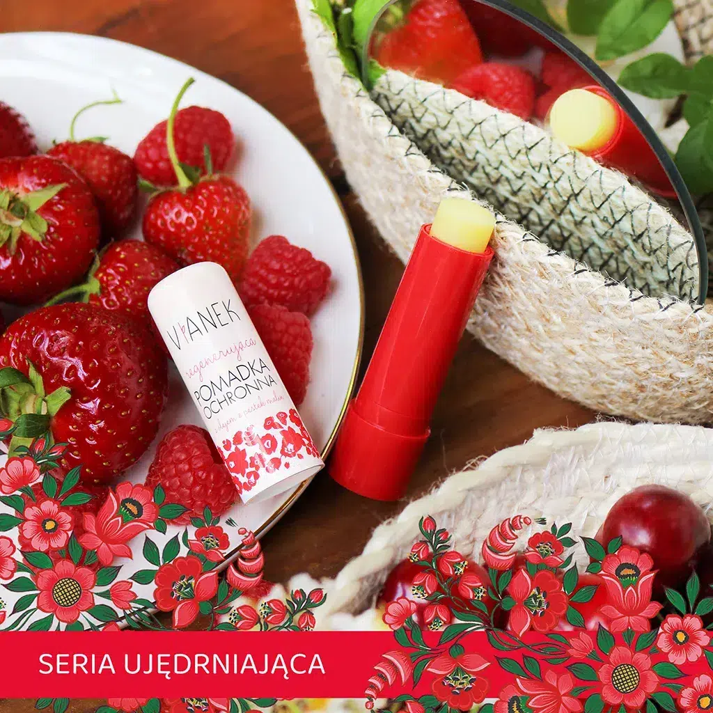 Regenerująca pomadka ochronna intensywnie pielęgnuje usta, zapobiegając przesuszeniu i pękaniu delikatnego naskórka. Pomadka posiada w składzie tłoczone na zimno oleje z wiesiołka, jojoba, malinowy i sojowy, a także masła kakaowe oraz shea. Ma owocowy zapach i smak.