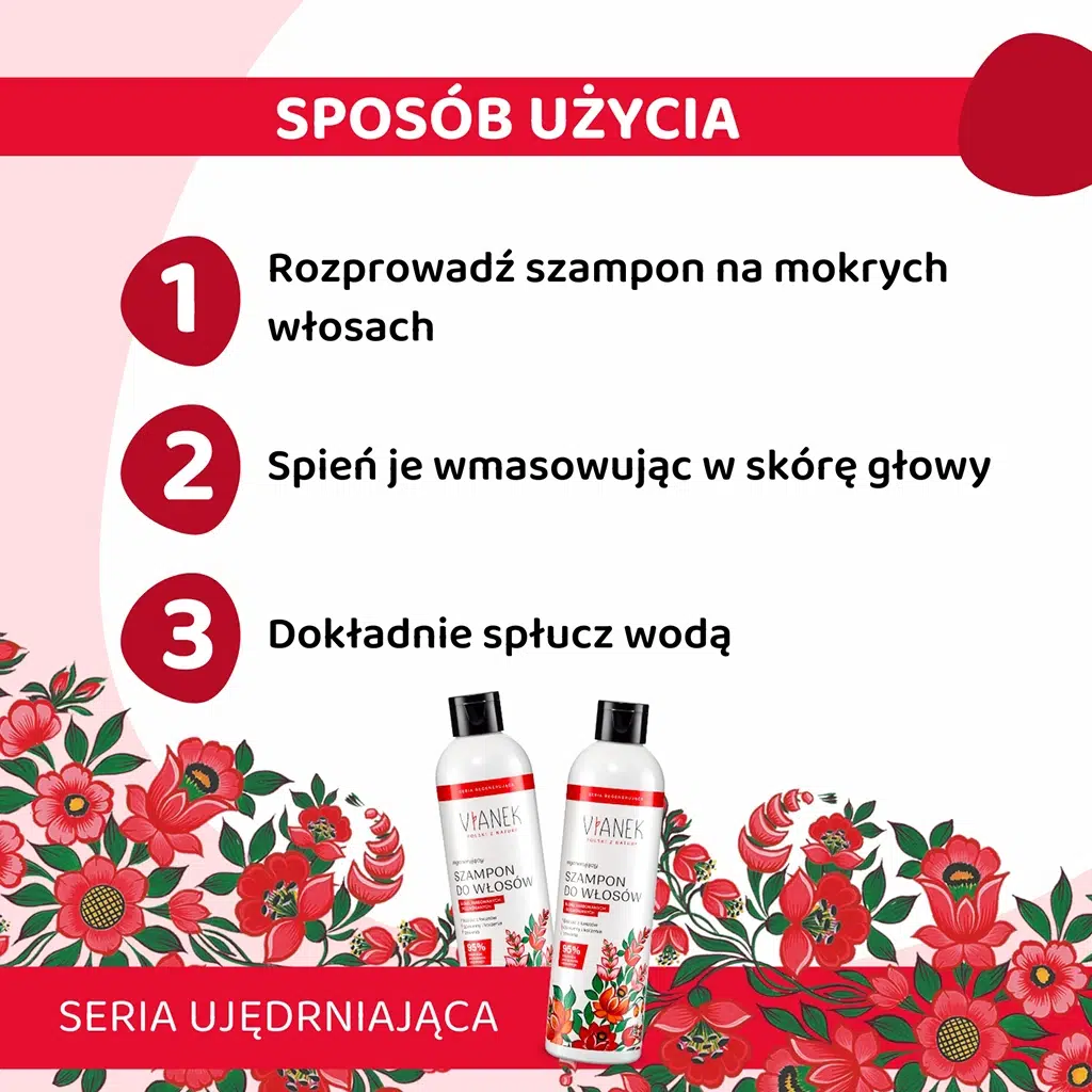 Rozprowadź szampon na mokrych włosach i spień wmasowując w skórę głowy. Dokładnie spłucz. W razie potrzeby można czynność powtórzyć.