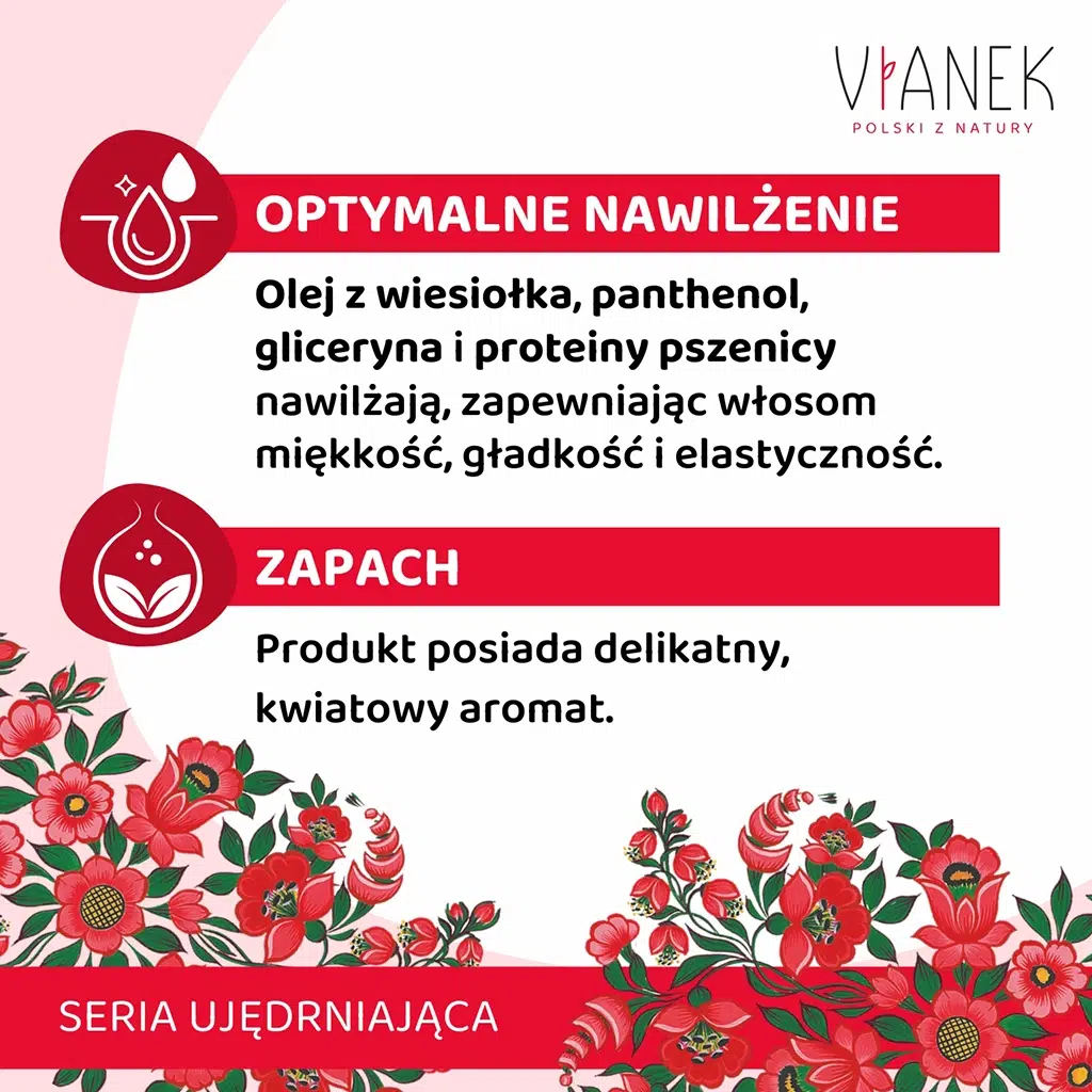 W składzie znajduje się gliceryna, proteiny pszenicy i panthenol, które intensywnie pielęgnują włosy, nawilżając je, wzmacniając i wygładzając. Z kolei za działanie odżywiające i nadające połysk odpowiada zawarty w szamponie olej z wiesiołka, który jest bogaty w witaminę E, która dodatkowo odbudowuje zniszczone łuski włosów. Ponadto ekstrakty z kwiatów dziewanny i korzenia rzewienia, bogate w krzem, podkreślają jasny kolor włosów i pomagają utrzymać tę barwę na dłużej.