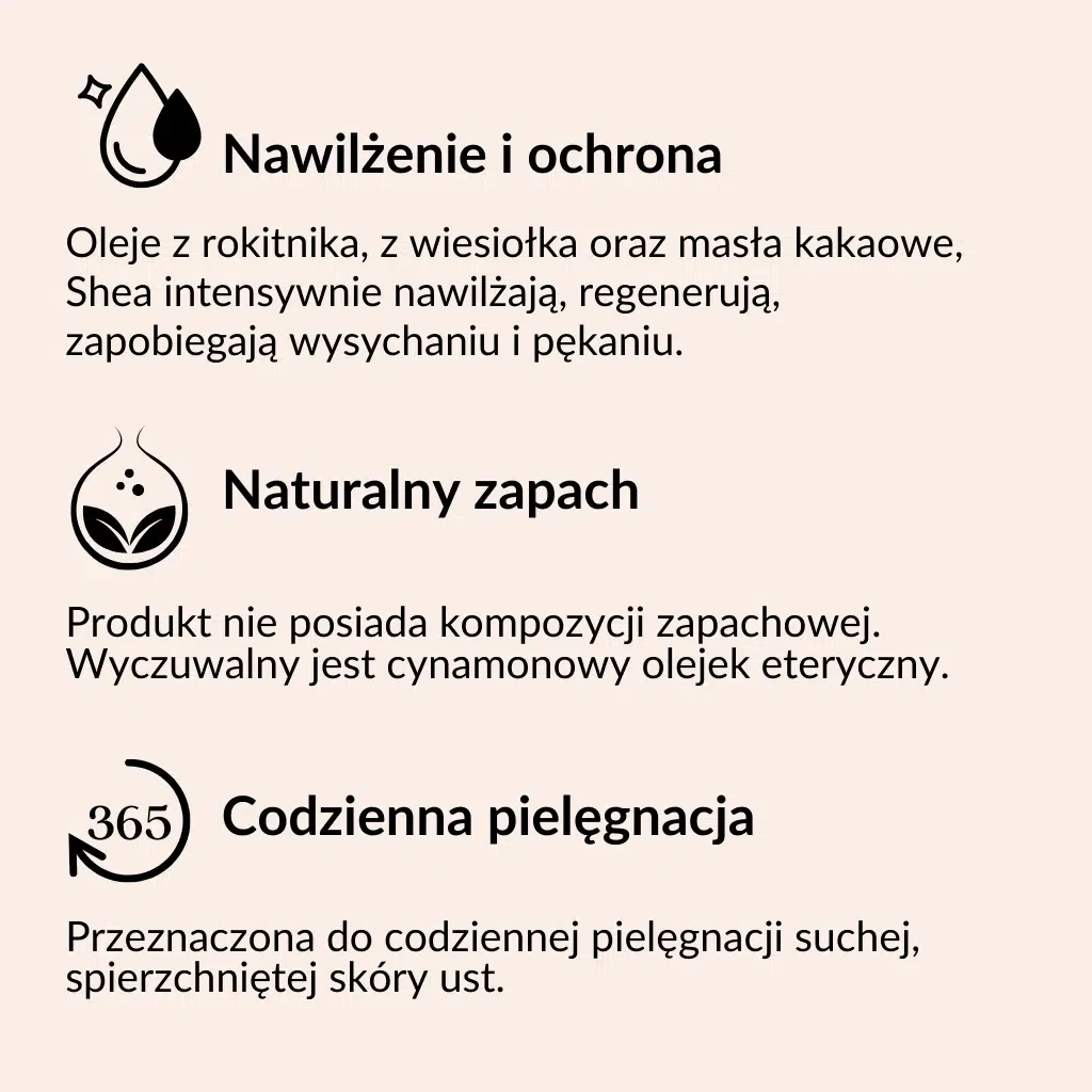 Rokitnikowa pomadka ochronna o zapachu cynamonu skuteczne nawilża i natłuszcza usta, dzięki czemu zabezpiecza je przed pękaniem i wysychaniem. Chroni także przed wiatrem, mrozem i promieniami słonecznymi.