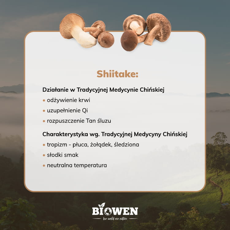 Chociaż właściwości grzybów Shiitake wciąż są badane, to wiele przeprowadzonych do tej pory badań wskazuje na to, że Shiitake mają pozytywny efekt na organizm. Głównymi składnikami, których dostarczają do codziennej diety, są polisacharydy i beta-glukany będące ważnym składnikiem obniżającym poziom cholesterolu we krwi. Dzięki temu możemy wspierać działanie układu krwionośnego. Ekstrakt z Shiitake Biowen został wzbogacony o BioPerine® (ekstrakt z owoców pieprzu czarnego), który jest standaryzowany na 95% piperyny.