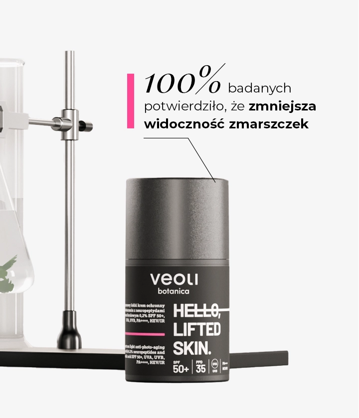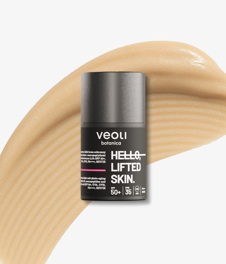 Szerokopasmowy lekki krem ochronny przeciw fotostarzeniu z neuropeptydami 0,2% i kwasem ferulowym 0,2% SPF 50+, UVA, UVB, PA++++, HEV/IR Hello, Lifted Skin 50 ml - Veoli Botanica