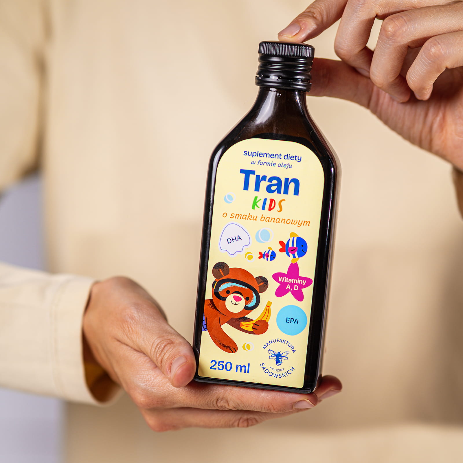 Tran Kids o smaku bananowym w postaci oleju 250 ml - Manufaktura Rodziny Sadowskich