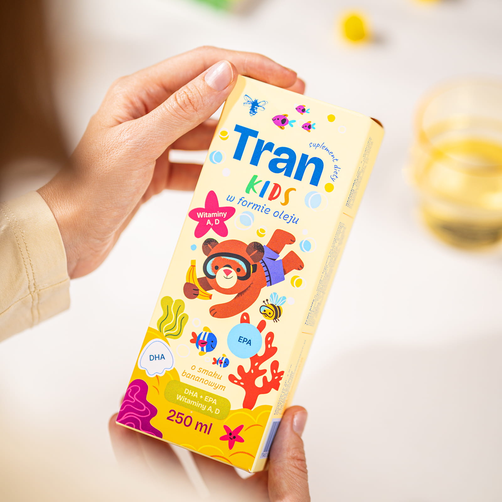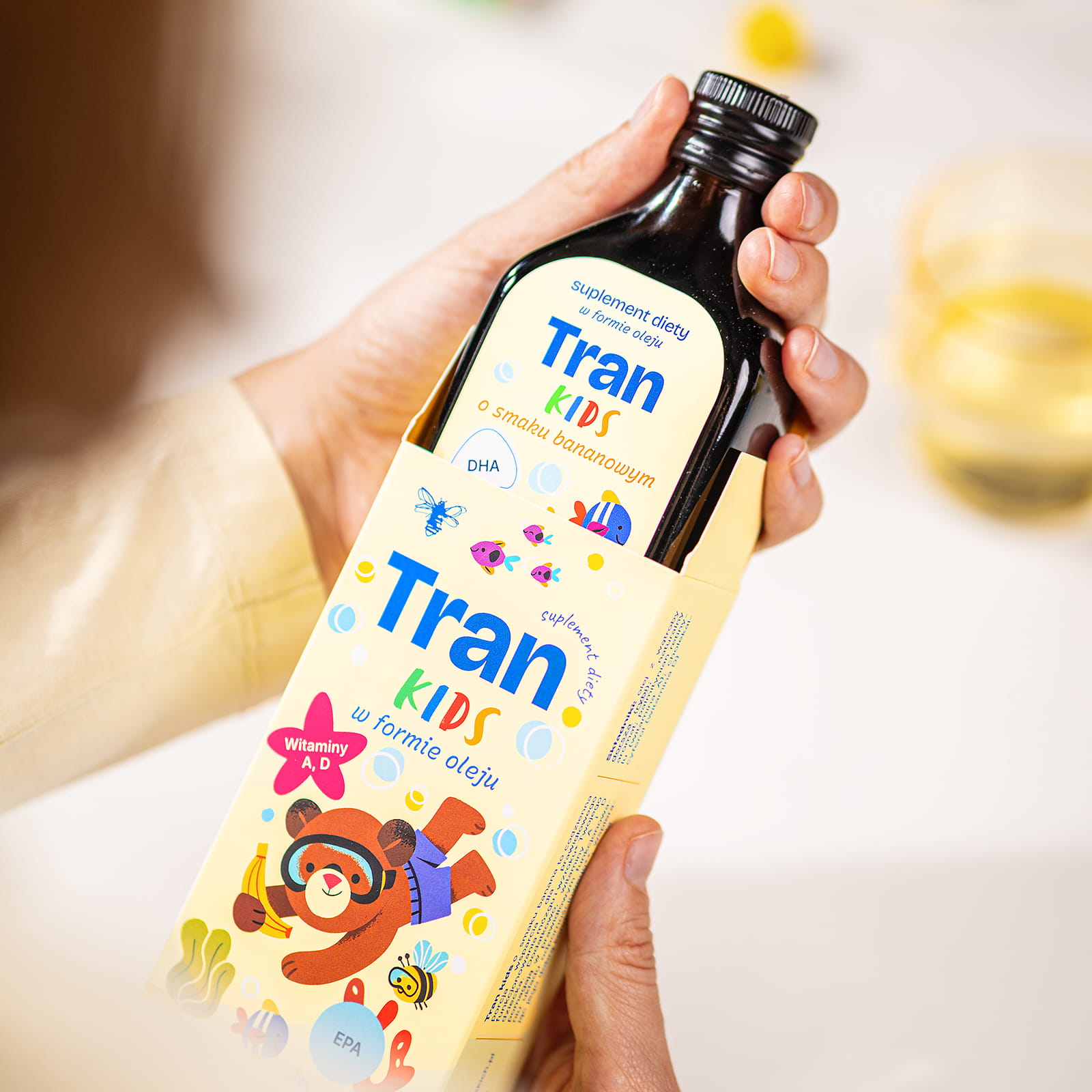 Tran Kids to naturalny olej z wątroby dorsza, bogaty w kwasy tłuszczowe Omega-3 - EPA i DHA, które wspierają prawidłowy rozwój mózgu i wzrok. Tran Kids jest pozyskiwany wyłącznie z wątroby dorsza ze zrównoważonych połowów - to w 100% czysty, naturalny produkt, bez zbędnych dodatków i bez konserwantów. Dodatek witaminy A wspiera prawidłowe widzenie, a witamina D pomaga budować odporność, troszcząc się jednocześnie o zdrowe kości i mięśnie. Dzięki delikatnemu bananowemu smakowi Tran Kids to pyszne i zdrowe wsparcie zarówno dla maluchów, jak i starszaków.