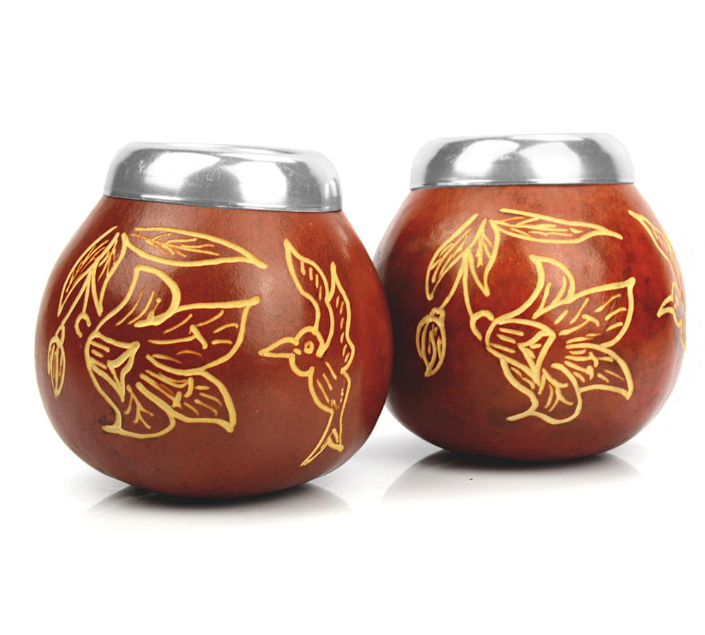Tadycyjne argentyńskie naczynie do yerba mate wykonane z owocu tykwy. Brązowe, dodatkowo wyżłobione we wzory. Otwór okala metalowy pierścień, który spina i usztywnia naczynko oraz pełni także funkcję estetyczną.