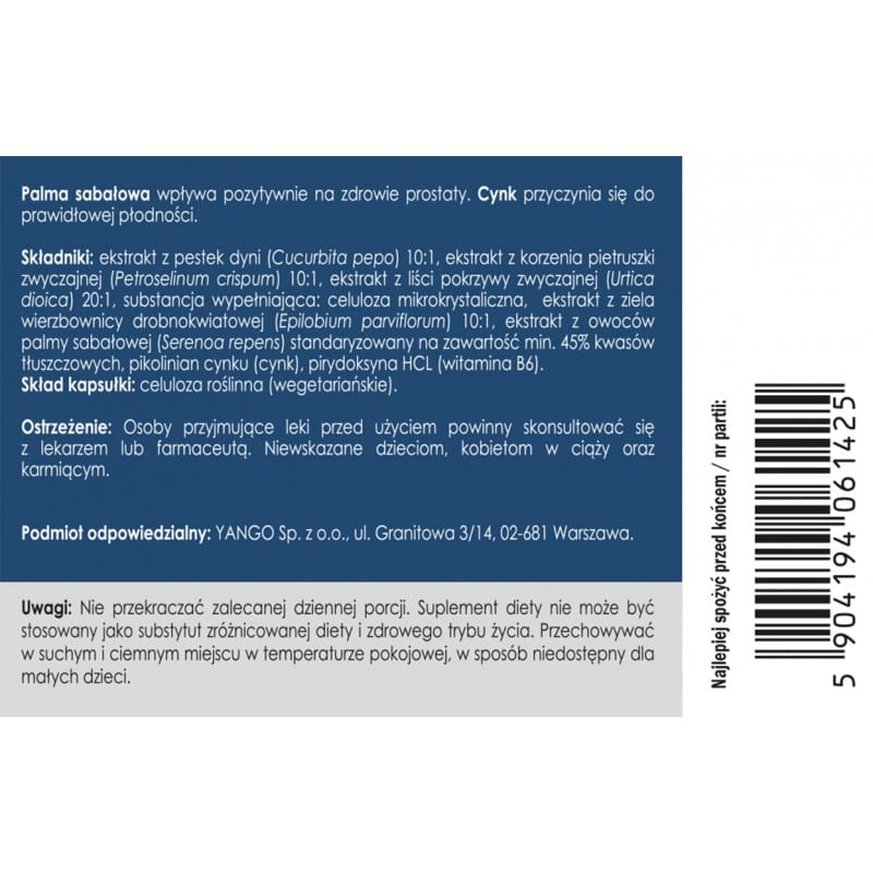 Ekstrakt z pestek dyni (Cucurbita pepo), ekstrakt z korzenia pietruszki zwyczajnej (Petroselinum crispim) 10:1, ekstrakt z liści pokrzywy zwyczajnej (Urtica dioica) 20:1, substancja wypełniająca:celuloza mikrokrystaliczna, ekstrakt z ziela wierzbownicy drobnokwiatowej (Epilobium parviflorum) 10:1, ekstrakt z owoców palmy sabałowej (Serenoa repens) standaryzowany na zawartość min. 45% kwasów tłuszczowych, pikolinian cynku (cynk), pirydoksyna HCL (witamina B6), skład kapsułki: celuloza roślinna (wegetariańskie)