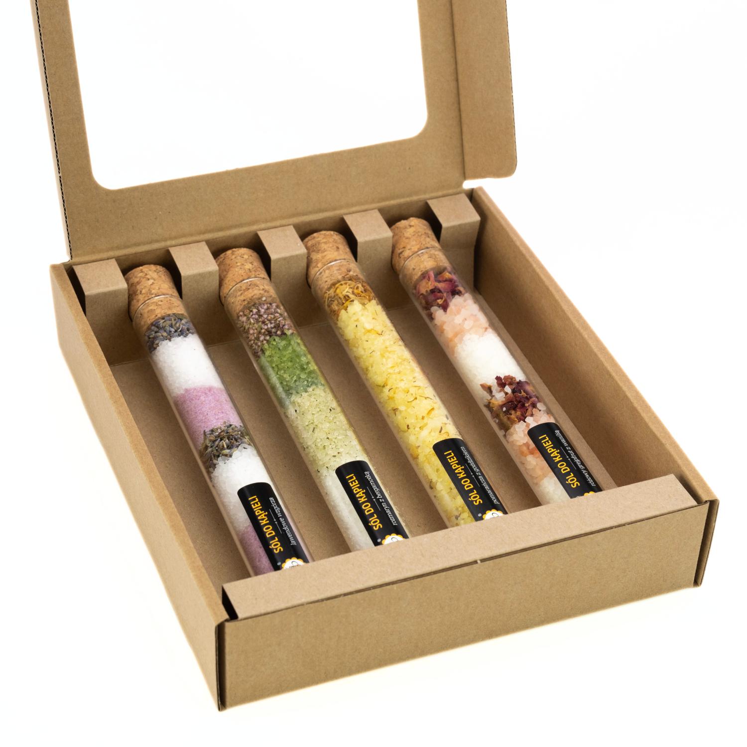 Fiolki z solami prezentują się uroczo i bardzo ciekawie, zapakowane są w estetyczne pudełko – jest to idealna propozycja na miły i oryginalny prezent dla wielbiciela kąpieli i relaksu w wannie.